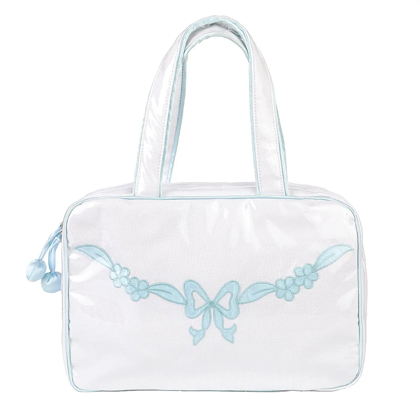 The Floral Bow Hanging Cosmetic Bag is the ultimate solution for organizing your beauty essentials. This bag is embroidered on treated pique fabric and covered with a clear plastic exterior, ensuring durability for years to come. Inside, you’ll find a practical layout with plastic lining and pockets and fold outs on both sides, offering ample space for all your cosmetics and a hook to hang out of the way. Featuring spacious elastic pouches and a secure zipper enclosure, this bag keeps your items neatly organized and easily accessible. Its easy-to-clean interior and exterior make maintenance a breeze.