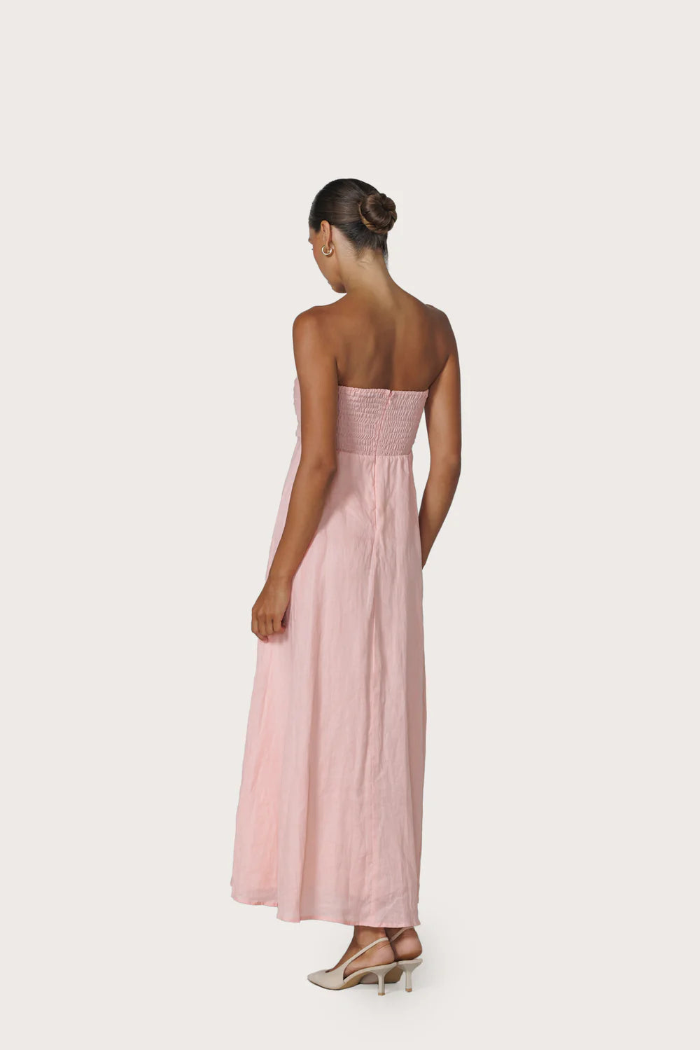 Introducing the Talia Maxi Linen Dress in Pink Lady, a timeless strapless design defined by structured pintuck detailing across the bodice. The style features a smocked elastic back with a concealed zipper for a flexible fit, falling to an effortless A-line skirt. Fully lined for comfort and ease, this piece offers refined simplicity with a feminine silhouette.