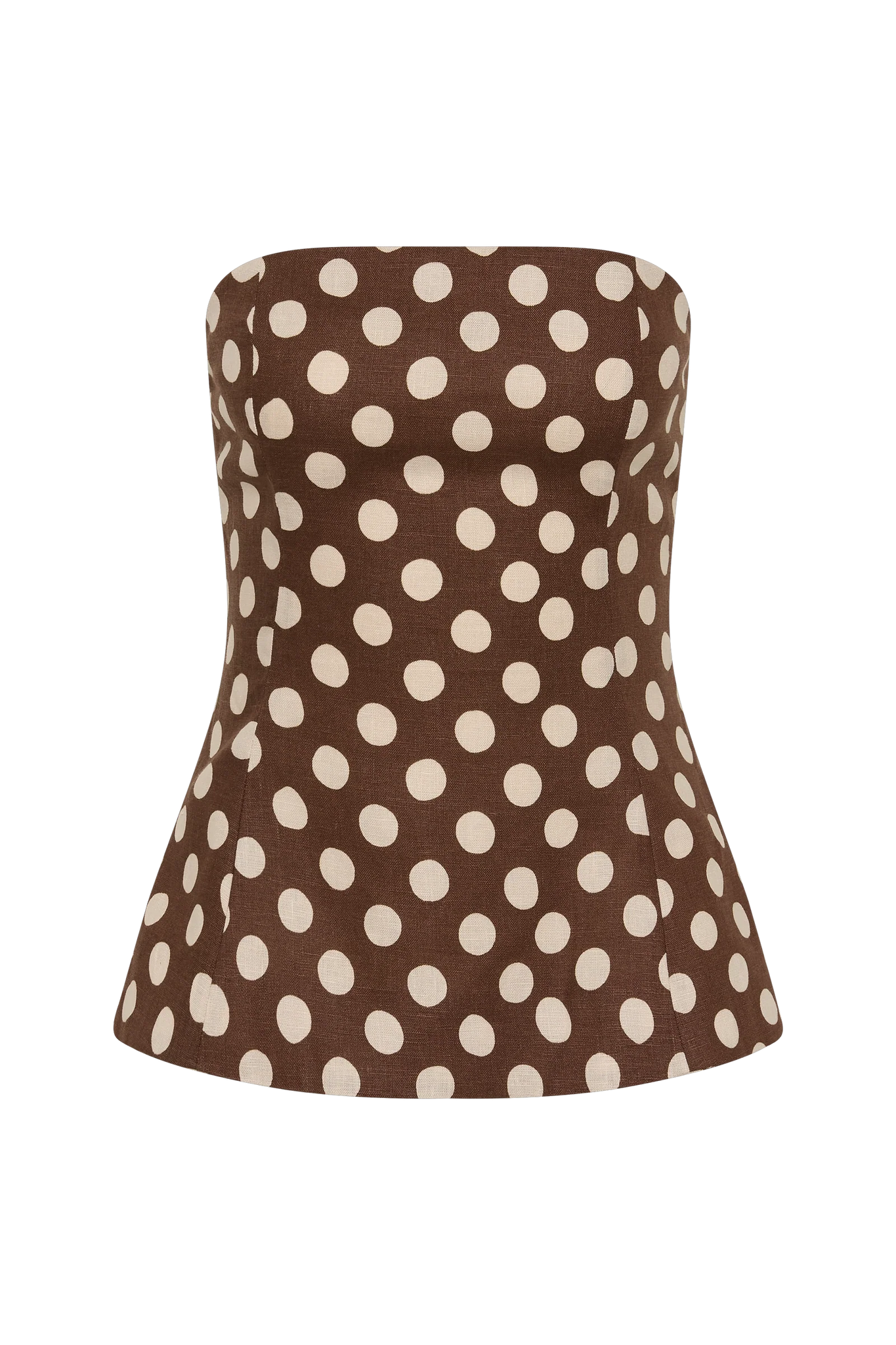 A strapless top, designed from a signature 100% European Flax® linen in a vintage-inspired chocolate polka dot print. Fitted through the bust, from the waist it flares into a peplum hem that crops around the hips. Style with the matching Valeria Capri Pant for a nostalgic matching set.
