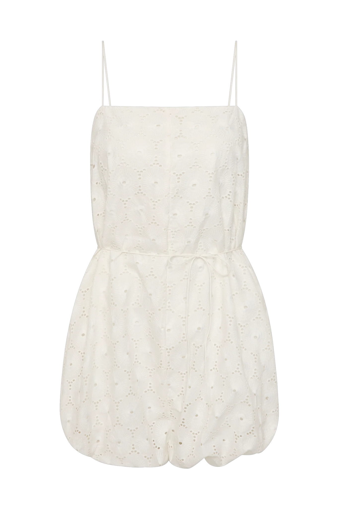 A bubble-style playsuit, designed from a delicate, vintage-inspired cotton broderie in a warm white. Relaxed in its silhouette, it is intended to hang effortlessly off the body and cuff at the shorts with an elasticated hem. There is a detachable waist tie to offer subtle cinching and can be tied to your desire. Style with the matching Paloma Head Scarf for a nostalgic touch to your vacation wardrobe.