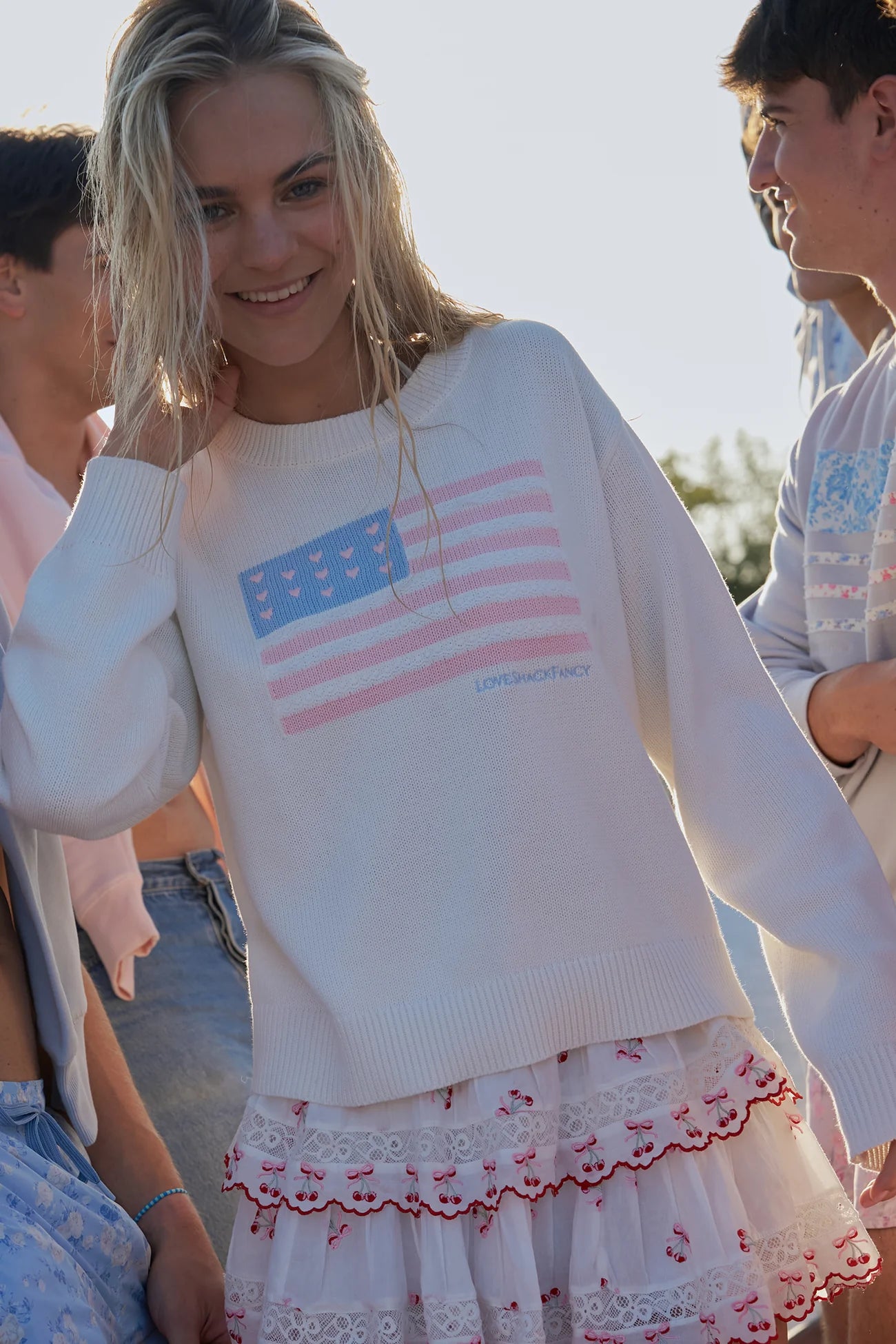 Introducing the Ty Pullover as part of our America’s Sweetheart Cotton Collection. This spirited sweatshirt features an American flag graphic that’s knit in intarsia on the front with little hearts embroidery and LoveShackFancy at the bottom of the flag. Arriving in an ultra-soft cotton, the layer has a relaxed and longer silhouette with long sleeves.