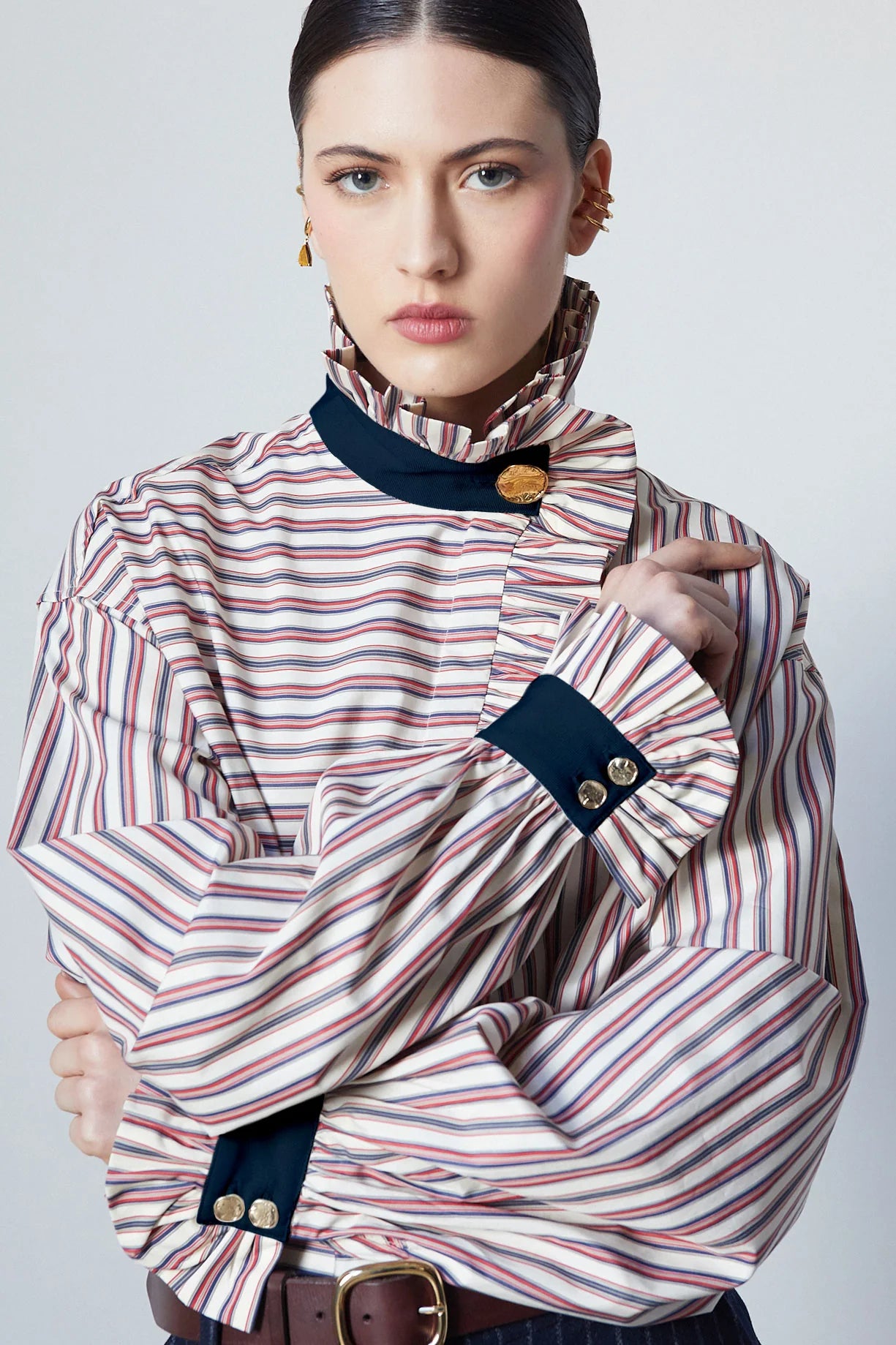 Exclusive, timeless and honest: a striped version of the shirt that carries our DNA to the bone. Long-sleeved shirt with ruffled cuffs and collar, finished with gold-plated buttons. Made from Portuguese premium cotton with stripes in red tones.