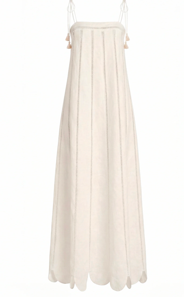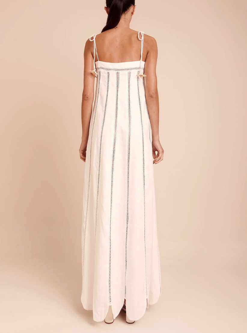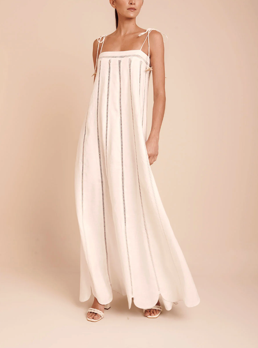 Nilo Dress is a long dress with a flowing, vertical silhouette, made from 100% linen. Its design is defined by linear bobbles that run down the body, adding visual lightness and rhythm. It features adjustable straps with handmade iraca palm flower details and a scalloped hem that reinforces its delicate, architectural character.