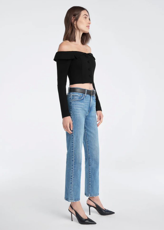 A new mid-rise, straight jean that's fitted at the hip and hits at the ankle.