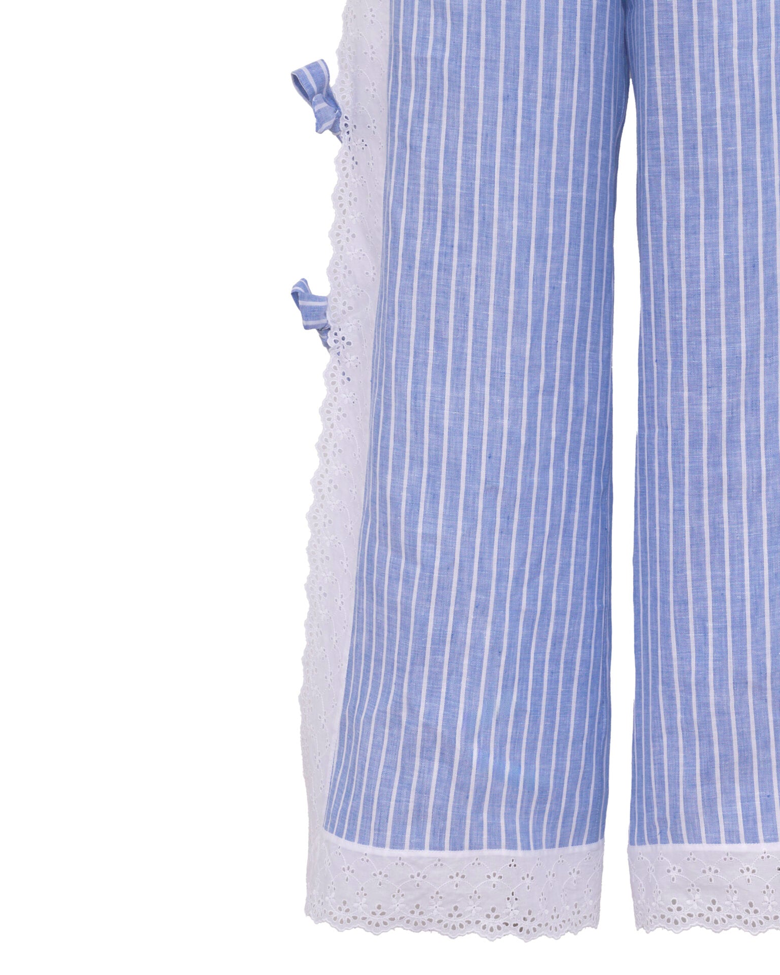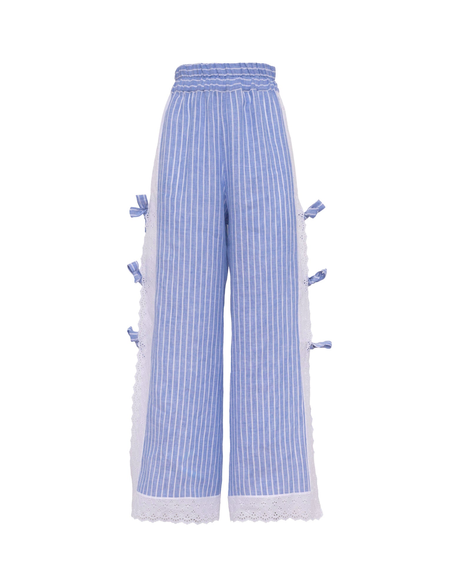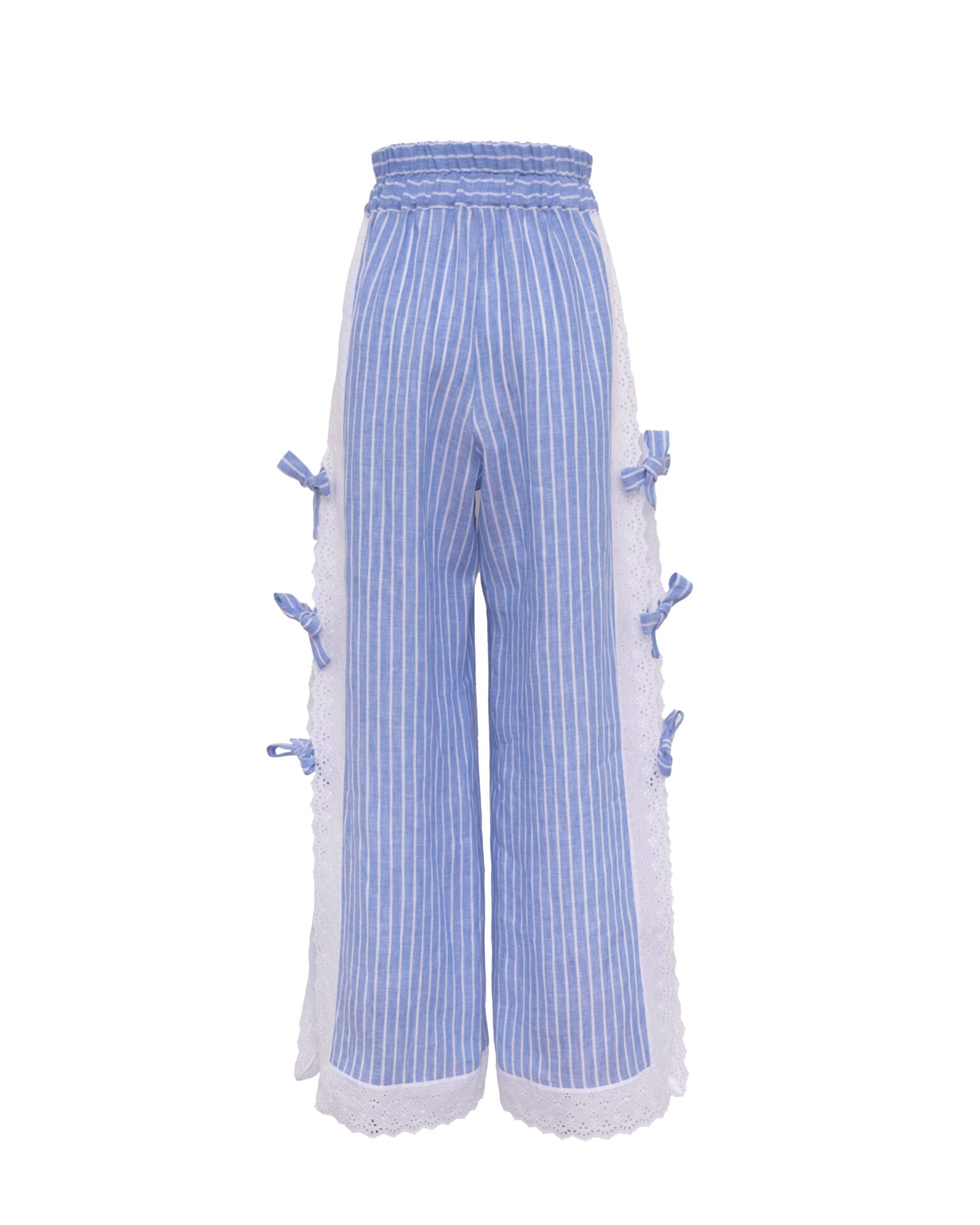 Long elastic waisted pants with sangallo edges and little bows on both sides.