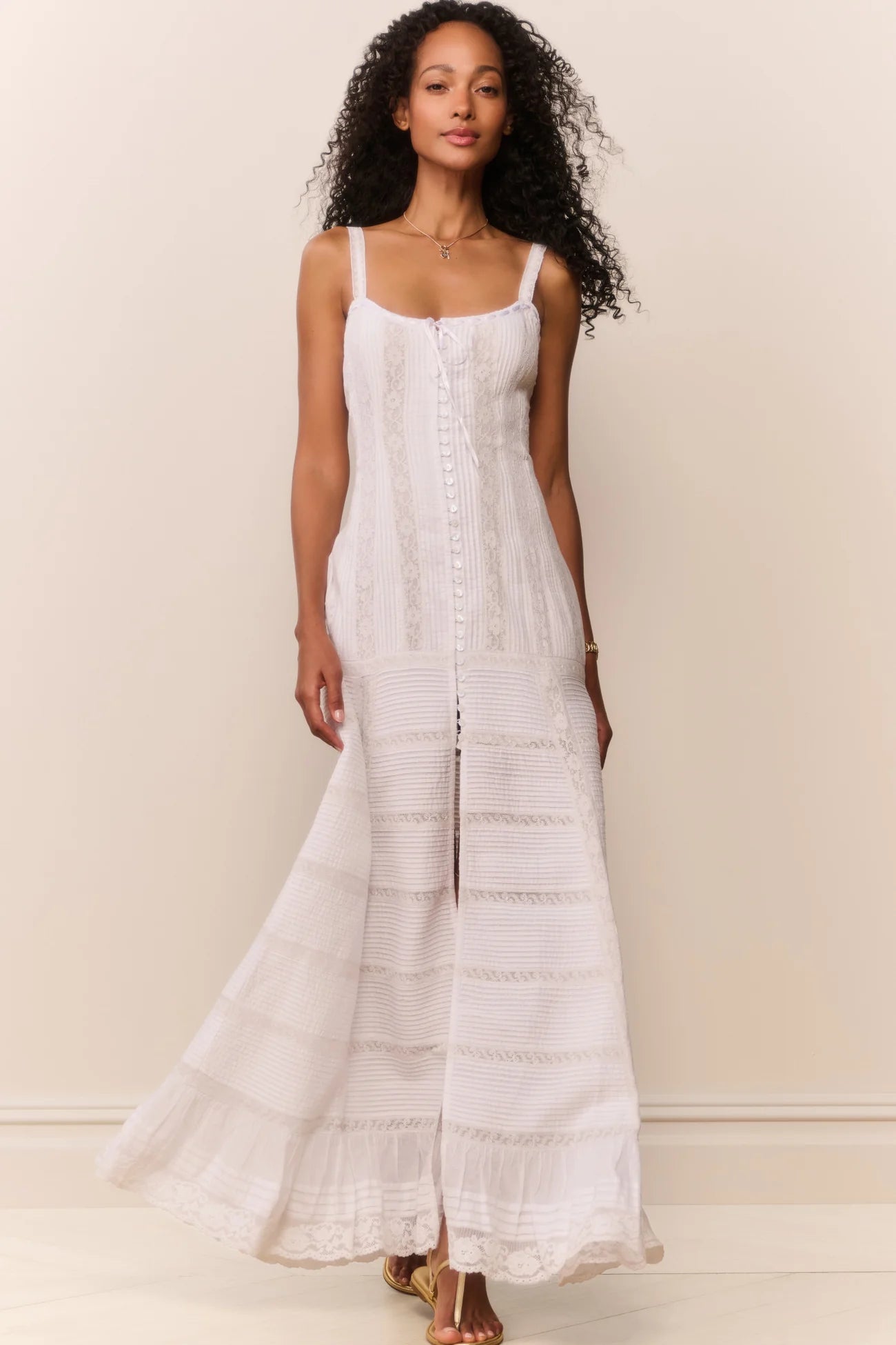 Fall in love with the Calyx Cotton Maxi Dress. This signature sheath silhouette is crafted from lightweight cotton, creating an effortlessly chic warm-weather look. Vertical lace insets cascade down the fitted bodice to a sweeping skirt, finished with lace trim at the hem and a center front slit for graceful movement.