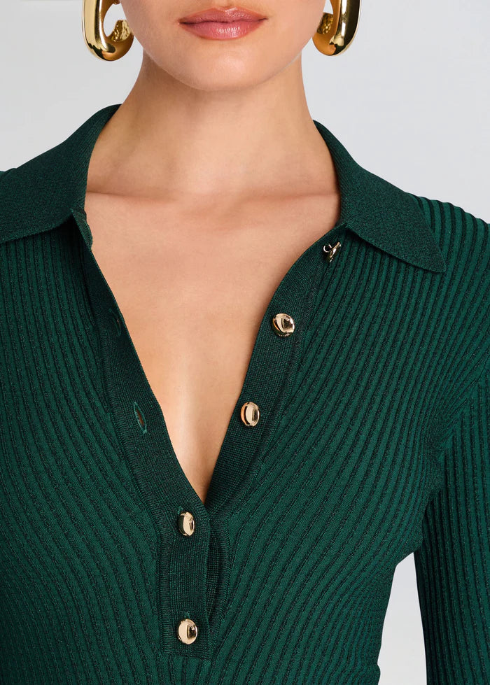 The Buffy Knit Midi Dress effortlessly transitions from day to night with its versatile design. Made from soft knit fabric, this midi features a button-up front and a polished collar for a smooth finish. Shown here in Metallic Pine.